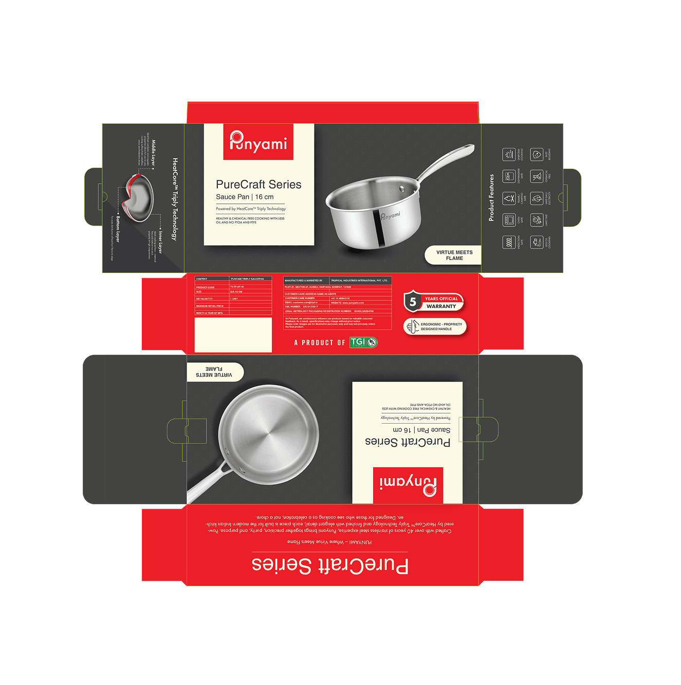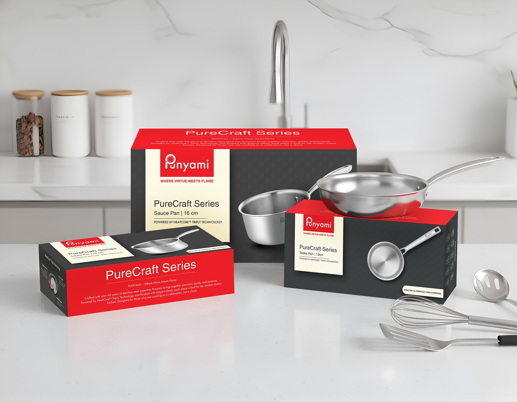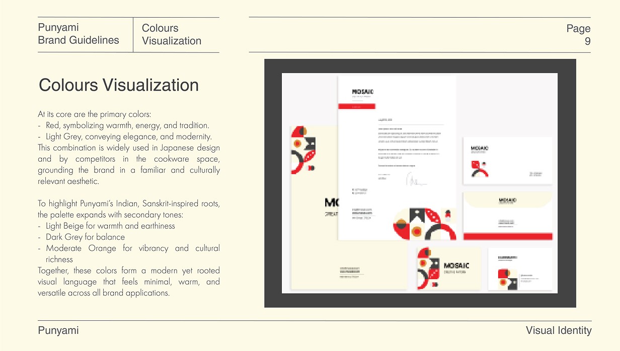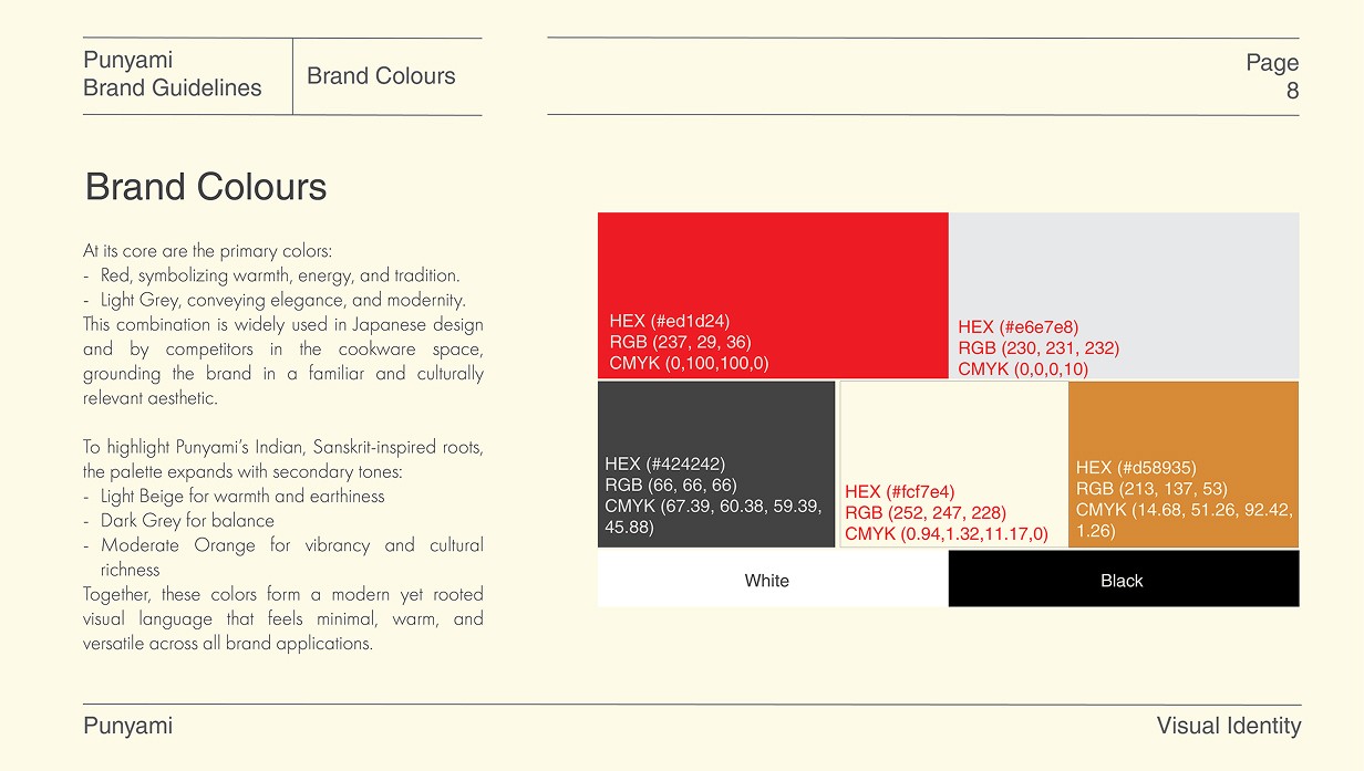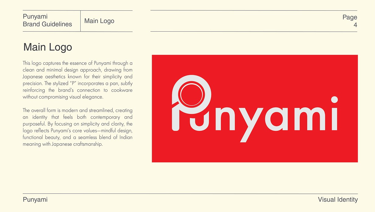 The intent was to keep the brand rooted in Indian warmth through colour and emotion, while following the discipline, simplicity, and structural clarity inspired by Japanese modernism. Together, these decisions shape Punyami into a cohesive and premium cookware brand defined by precision and quiet confidence.